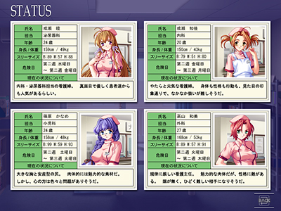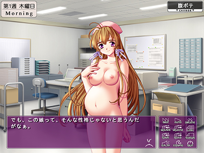 各ターゲットには受胎の可能性が高い「危険日」がそれぞれ設定されています。 「危険日」はメッセージウィンドウの右にあるボタンから呼び出すことのできる「ステータス画面」で確認することができます。 また、危険日には通常よりも激しく中出しを拒むなど、反応がより悲痛なものに変化します。 |