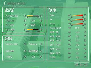 文章の表示速度やスキップ/オートモードの速度、キャラクターごとの音声ON/OFFやBGM・効果音・音声の音量設定など、様々な項目を好みに合わせて設定可能!!