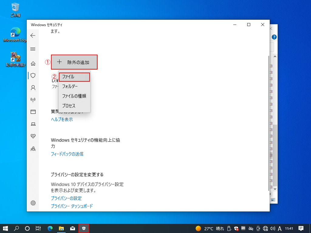 22:Windows画面下部のタスクバーにある「Windowsセキュリティ」をクリックし、11:で開きました画面へ切り替えします。「+除外の追加」をクリックし、続いて「ファイル」をクリックします。